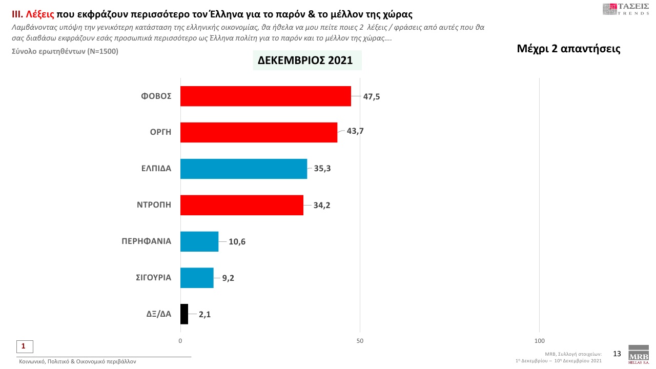 Η λέξη «Φόβος» σε ποσοστό 47,5 % εκφράζει περισσότερο τους πολίτες για το παρόν και το μέλλον της χώρας, ακολουθούν η «Οργή» με ποσοστό 43,7 %, η «Ελπίδα» με 35,3 % και η «Ντροπή» με 34,2 %.