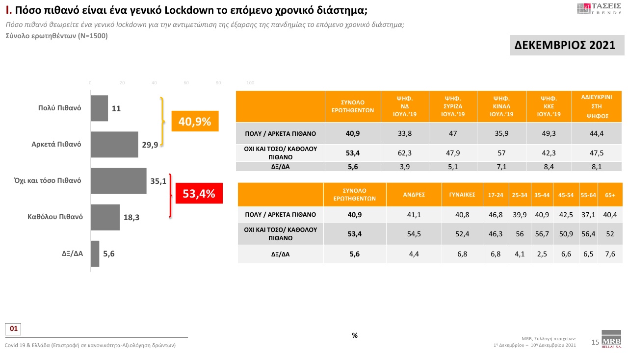 Στο ερώτημα “πόσο πιθανό είναι ένα γενικό lockdown το επόμενο διάστημα;”, το 40,9% απαντά “πολύ πιθανό/αρκετά πιθανό”.