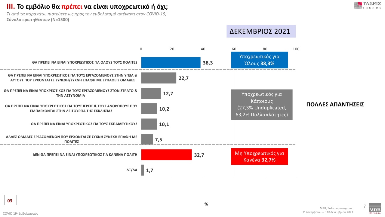 Στην ερώτηση περί υποχρεωτικότητας των εμβολίων COVID-19 το 38,3% δηλώνει ότι πρέπει να είναι υποχρεωτικός για όλους (27% Ιουν. 2021), το 22,7% να είναι υποχρεωτικός για εργαζόμενους στον τομέα υγείας και για εργαζόμενους που έρχονται σε επαφή με ευπαθείς ομάδες (20,6% Ιουν. 2021), το 12,7% στους εργαζόμενους τις ένοπλές δυνάμεις και στα σώματα ασφαλείας, το 10,2% στους ιερείς και στους ανθρώπους που εμπλέκονται με την λειτουργία της εκκλησίας και το 10,1% στους εκπαιδευτικούς. Τέλος το 32,7% (41,5% Ιουν. 2021) πιστεύει ότι οι εμβολιασμοί δεν πρέπει να είναι υποχρεωτικοί για κανένα και καμία κατηγορία πολιτών.