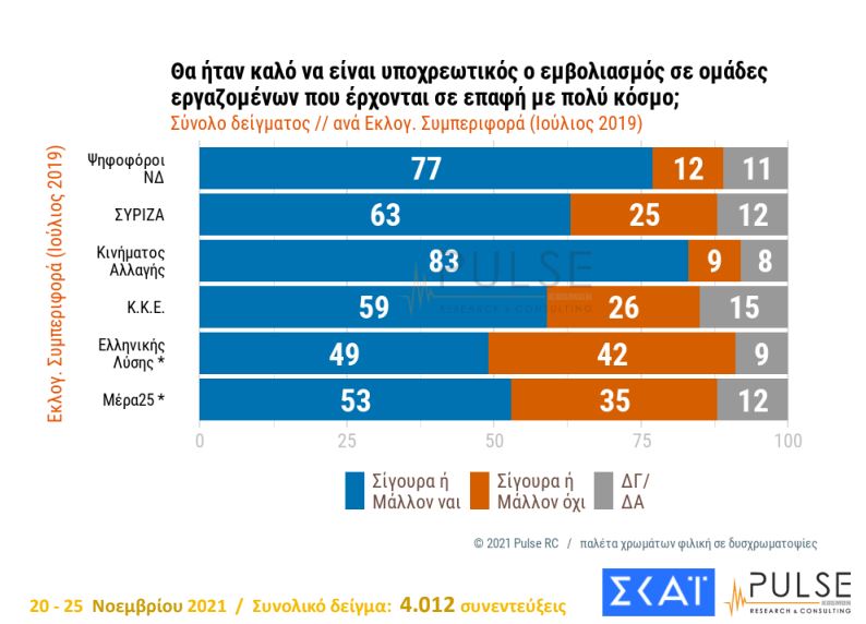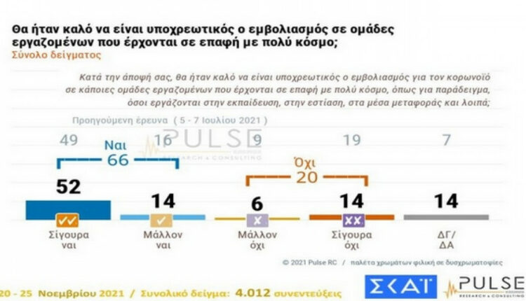 Υπέρ της επέκτασης της υποχρεωτικότητας του εμβολιασμού σε ομάδες εργαζομένων που έρχονται σε επαφή με πολύ κόσμο τάσσεται η πλειοψηφία των πολιτών σε ποσοστό 66%, σύμφωνα με τη μεγάλη δημοσκόπηση του ΣΚΑΪ και της Pulse που παρουσιάστηκε στο κεντρικό δελτίο ειδήσεων με τη Σία Κοσιώνη.