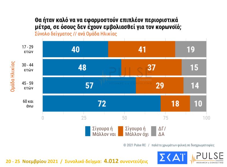 Ανά ηλικιακή ομάδα, αυτοί που «ψηφίζουν» υπέρ νέων περιοριστικών μέτρων για όσους δεν έχουν εμβολιαστεί για τον κορωνοϊό είναι πολίτες μεγαλύτερης ηλικίας. Αναλυτικά, το 72% των ερωτηθέντων άνω των 60 ετών ζητά επιπλέον μέτρα σε ποσοστό 72%, ακολουθεί η ομάδα 45-59 ετών με 57%, ενώ το ποσοστό στους 30-44 ετών και στους 17-19 ετών διαμορφώνεταο στο 48% και στο 40% αντίστοιχα.