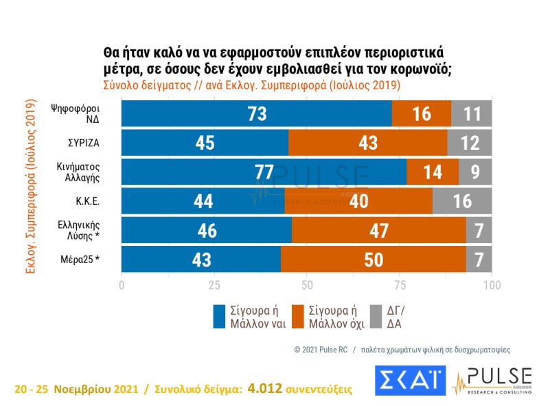 Παράλληλα, θετικοί στην εφαρμοφή επιπλέον περιοριστικών μέτρων για τους ανεμβολίαστους εμφανίζονται περίπου 6 στους 10 συμμετέχοντες στη δημοσκόπηση, με το 44% του δείγματος να απαντά «σίγουρα ναι» και το 12% «μάλλον ναι», ενώ το 30% των ερωτηθέντων απαντά αρνητικά (18% λέει «σίγουρα όχι» και το 12% «μάλλον όχι»), ενώ το 14% δεν παίρνει θέση (δεν γνωρίζει/δεν απαντά).