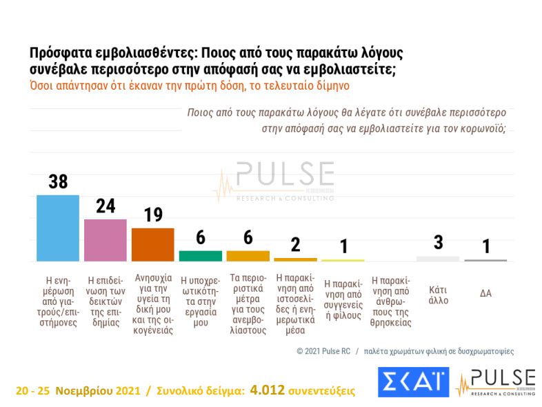 Τέλος, αναφορικά με τους λόγους που οδήγησαν πρώην αρνητές του εμβολίου, να εμβολιαστούν για τον κορωνοϊό, το 38% του δείγματος δηλώνει ότι ενημερώθηκε από γιατρούς κι επιστήμονες, το 24% το αποδίδει στην επιδείνωση των υγειονομικών δεικτών, το 19% στην ανησυχία για την υγεία τη δική του ή της οικογένειας του, ενώ το 12% αναφέρει ότι εμβολιάστηκε λόγω της υποχρεωτικότητας στην εργασία του και των περιοριστικών μέτρων που ελήφθησαν για τους ανεμβολίαστους (6% και 6% αντίστοιχα).