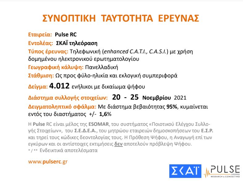 Η έρευνα της Pulse είναι πανελλαδική και έγινε τηλεφωνικά με τη χρήση δομημένου ηλεκτρονικού ερωτηματολογίου. Το δείγμα αφορούσε σε 4.012 ενηλίκους με δικαίωμα ψήφου και πραγματοποιήθηκε το διάστημα 20-25 Νοεμβρίου 2021.