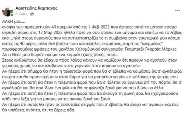 Ο Αριστείδης Καμπανός με ανάρτησή του στο λογαριασμό του στο facebook θέλησε να στείλει ένα ιδιαίτερα φορτισμένο συγκινησιακά μήνυμα μέσα από τις παραφρασμένες φράσεις του Κολομβιανού συγγραφέα Γκαμπριέλ Γκαρσία Μάρκες.