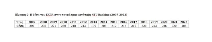 Η συγκεκριμένη θέση που έλαβε το ΕΚΠΑ είναι η υψηλότερη στην δεκαπενταετία (2007-2022), στην οποία η εν λόγω κατάταξη δημοσιεύει αποτελέσματα, σύμφωνα με τον ακόλουθο πίνακα: