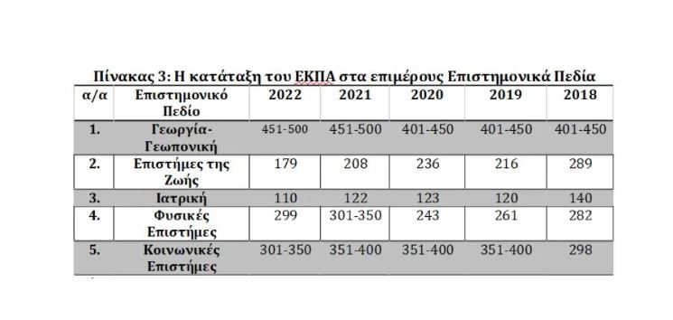 Ιδιαίτερη μνεία θα πρέπει να γίνει στο επιστημονικό πεδίο της Ιατρικής το οποίο τοποθετείται στην 110η θέση στον κόσμο, έχοντας ανέβει τριάντα θέσεις σε σχέση με την κατάταξη του 2018 και στις επιστήμες της ζωής στην 179η θέση παγκοσμίως, έχοντας ανέβει 110 θέσεις σε σχέση με την κατάταξη του 2018.