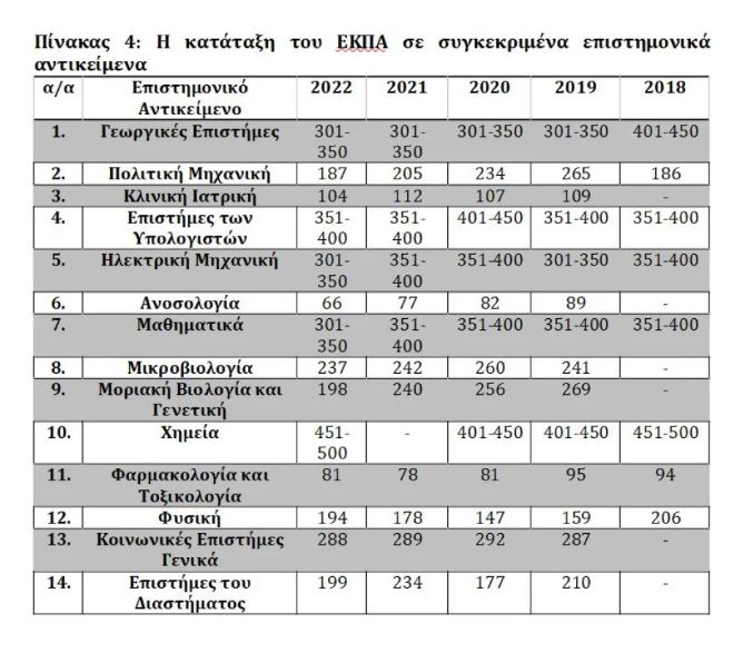 Στην κατάταξη των επιμέρους επιστημονικών αντικειμένων το ΕΚΠΑ έχει συμπεριληφθεί και αξιολογηθεί θετικά, δηλαδή σε θέσεις κάτω από την θέση 500, σε 14 από τα 27 αντικείμενα της Κατάταξης, όπως φαίνεται στον πίνακα παρακάτω: