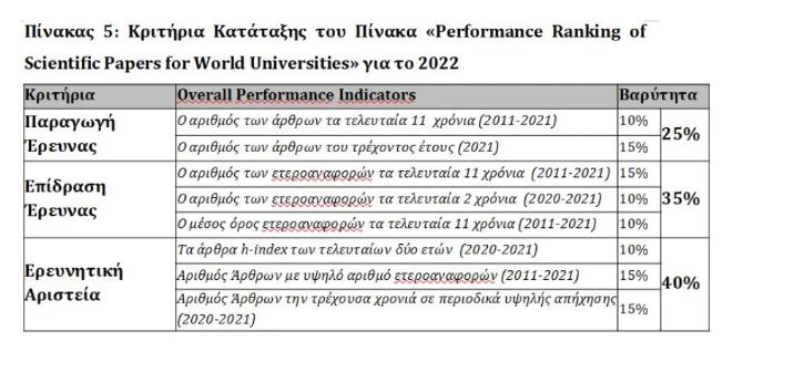 Η αξιολόγηση «Performance Ranking of Scientific Papers for World Universities» στηρίζεται αποκλειστικά στο ερευνητικό έργο που παράγεται και δημοσιεύεται σε κάθε Ίδρυμα, στην απήχηση που επιτυγχάνουν οι δημοσιευμένες εργασίες των μελών ΔΕΠ και ερευνητών του, καθώς και στην τελική ιδιαίτερη διάκρισή και αναγνώριση που λαμβάνουν ως δημοσιεύσεις με υψηλή απήχηση.