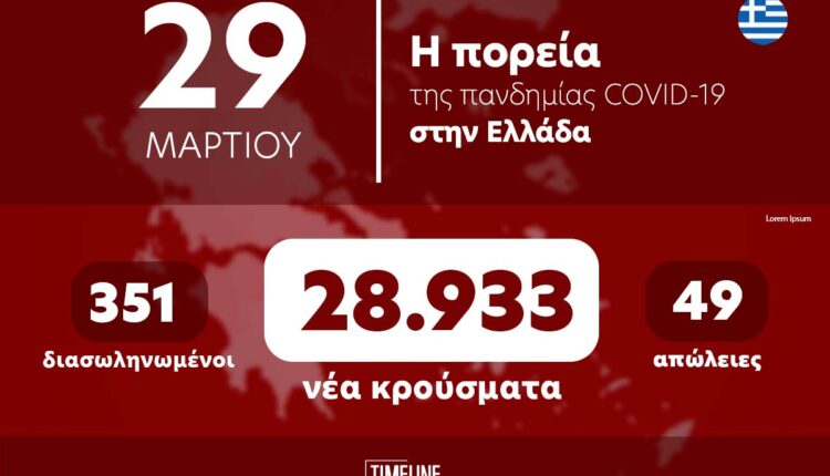 Τα νέα εργαστηριακά επιβεβαιωμένα κρούσματα της νόσου που καταγράφηκαν τις τελευταίες 24 ώρες είναι 28.933, εκ των οποίων 32 εντοπίστηκαν κατόπιν ελέγχων στις πύλες εισόδου της χώρας. Ο συνολικός αριθμός των κρουσμάτων ανέρχεται σε 2.986.882 (ημερήσια μεταβολή +1.0%), εκ των οποίων 49.2% άνδρες.