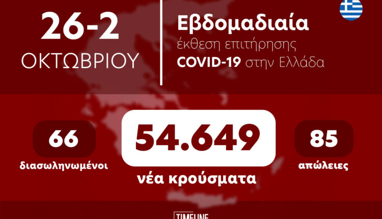 Στα 54.649 ανέρχονται τα νέα κρούσματα κορωνοϊού στη χώρα, σύμφωνα με την εβδομαδιαία αναφορά του ΕΟΔΥ.