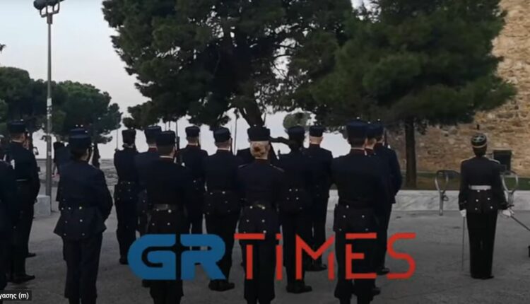Η έπαρση της σημαίας έγινε από τον δήμαρχο Θεσσαλονίκης, Κωνσταντίνο Ζέρβα και τον διοικητή του Γ’ Σώματος Στρατού, Αντιστράτηγο Σωτήριο Κωστάκογλου, παρουσία του υφυπουργού Εσωτερικών τομέα Μακεδονίας Θράκης, Σταύρου Καλαφάτη, ενώ αμέσως μετά η φρεγάτα «Σπέτσαι» έκανε χαιρετιστήριες βολές από το λιμάνι της πόλης.