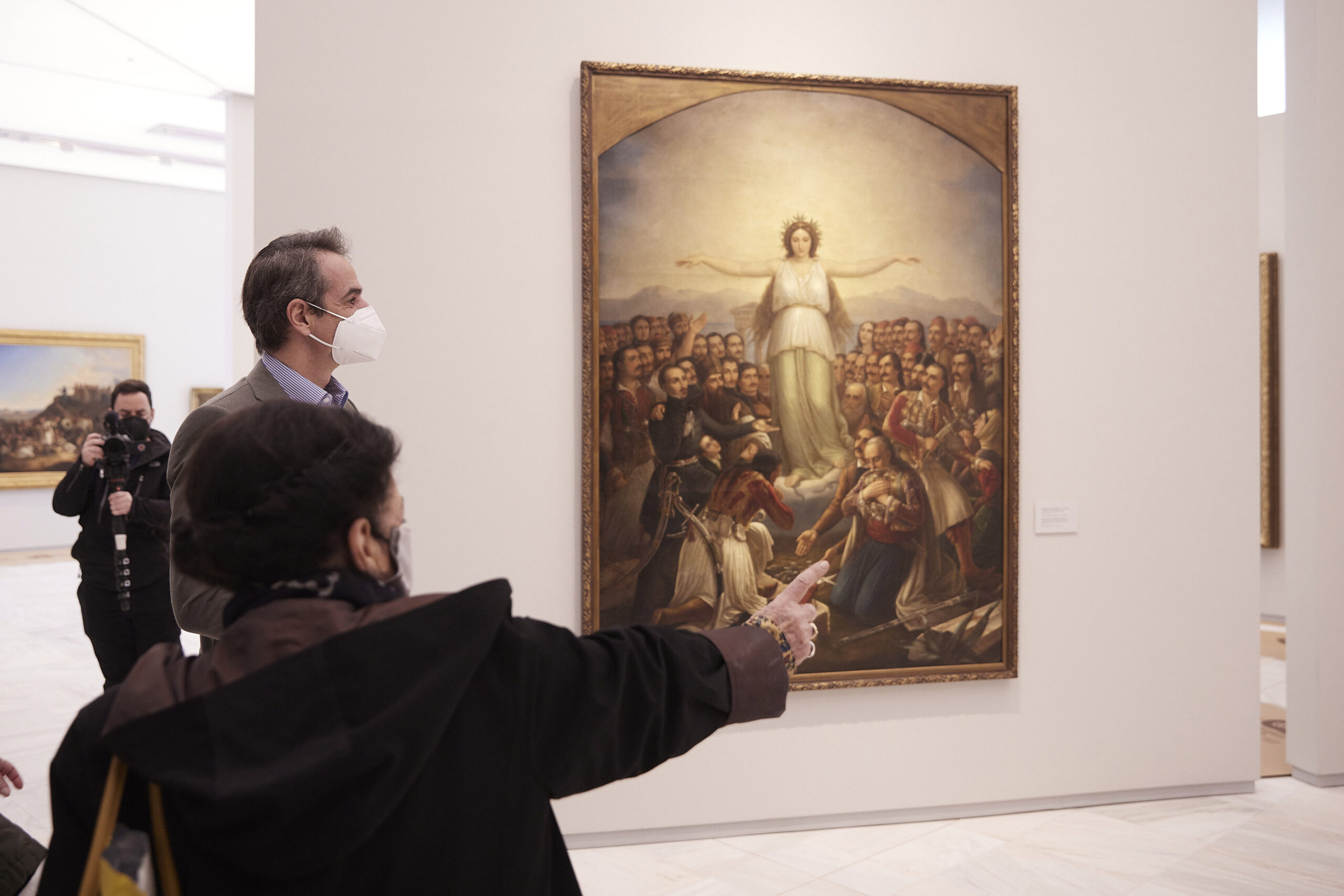 Στη μεγάλη αίθουσα της εισόδου, η οποία εμπλουτίζεται με διαδραστικές υποδομές, δεσπόζει η «Λαϊκή αγορά» του Τέτση. Ο Πρωθυπουργός επισκέφθηκε επίσης την πτέρυγα όπου εκτίθενται έργα που σχετίζονται με τον απελευθερωτικό αγώνα του 1821, όπως ο πίνακας «Η Ελλάς ευγνωμονούσα» του Βρυζάκη, αλλά και τις αίθουσες όπου φιλοξενούνται νεότερα έργα ελληνικής τέχνης.