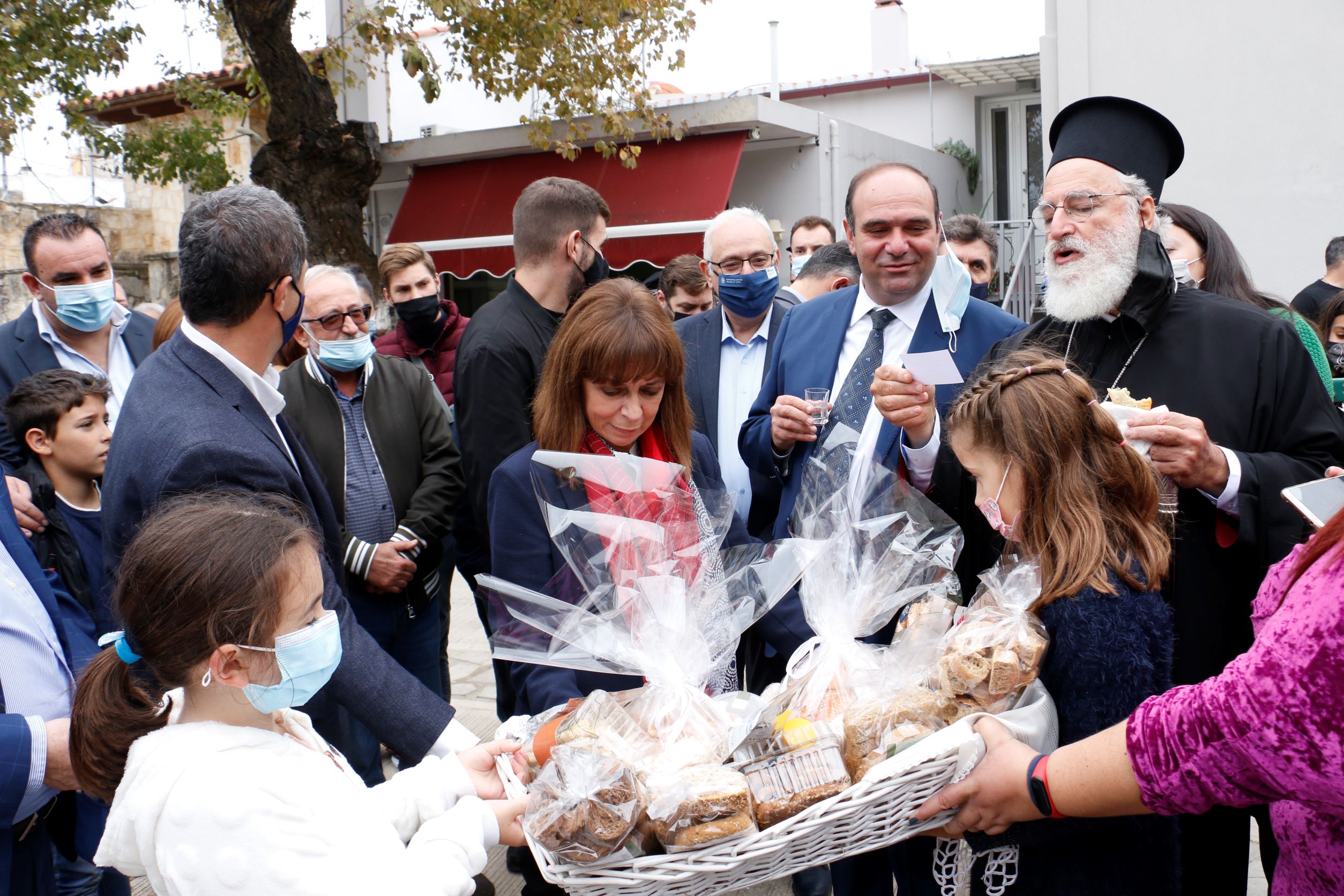 Στις Αγίες Παρασκιές του Δήμου Αρχανών Αστερουσίων την υποδέχθηκαν ο Περιφερειάρχης Κρήτης Σταύρος Αρναουτάκης και ο Δήμαρχος Μανόλης Κοκοσάλης σύμφωνα με το πρόγραμμα, ενώ στην υποδοχή συμμετείχαν ο Μητροπολίτης Καστελίου, Αρκαλοχωρίου και Βιάννου Ανδρέας και ο κυβερνητικός βουλευτής Ηρακλείου Μάξιμος Σενετάκης.