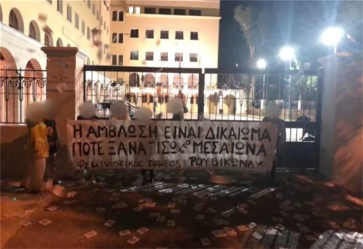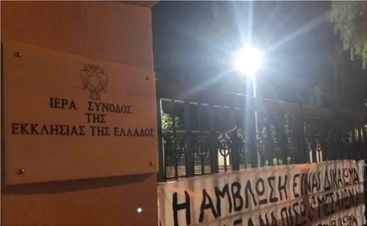 Τα μέλη της αναρχικής ομάδας κρέμασαν και πανό στην είσοδο του κτηρίου με το οποίο εξέφραζαν τη διαφωνία τους για τη θέση της Εκκλησίας όσον αφορά στις αμβλώσεις.