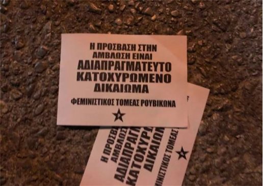 «Εμείς στεκόμαστε απέναντι σε όσους θέλουν να ορίζουν τα σώματά μας και προσπαθούν να μας γυρίσουν στο μεσαίωνα. Στεκόμαστε απέναντι σε αυτούς που καλλιεργούν το φόβο στις γυναίκες, ώστε να μην αποφασίζουν οι ίδιες για τις ζωές τους, είτε πιστεύουν σε θρησκείες είτε όχι» αναφέρεται μεταξύ άλλων στην ανακοίνωση του φεμινστικού τομέα του Ρουβίκωνα.
