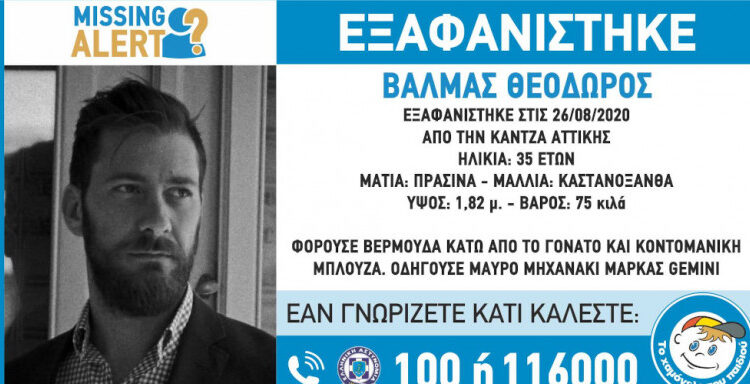 Συναγερμός έχει σημάνει για την εξαφάνιση του 35χρονου Θεόδωρου Βαλμά από την Κάντζα, τα ίχνη του οποίου χάθηκαν στις 26 Αυγούστου.