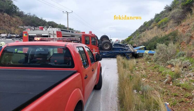 Η νταλίκα για άγνωστο λόγο εξετράπη της πορείας της με αποτέλεσμα να βγει από το οδόστρωμα σε σημείο μετά το Γαλαξίδι και κοντά στους Αγίους Πάντες.