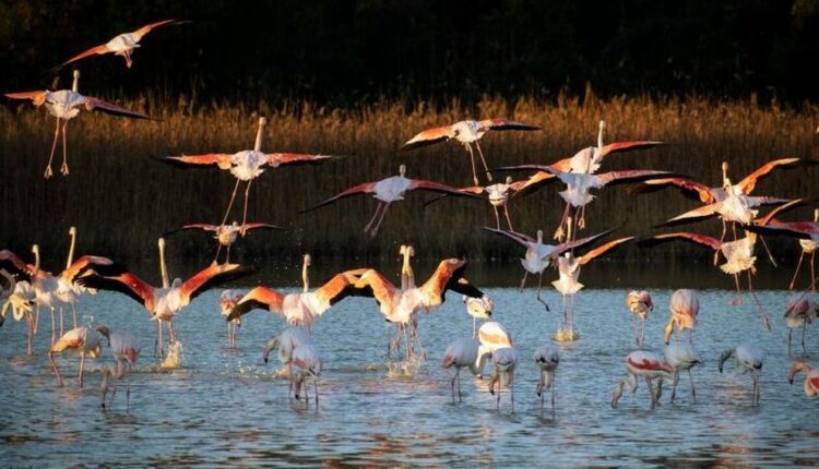 Ο φωτογραφικός φακός του Ηλία Ακριβού απαθανάτισε τα εντυπωσιακά φλαμίνγκο να κάνουν βόλτα αλλά και να πετούν πάνω από τα νερά της λίμνης δημιουργώντας ροζ χρώματα.