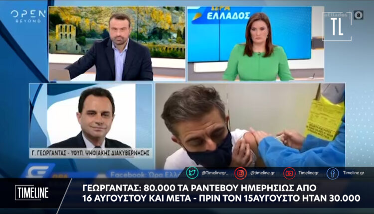 Ο υφυπουργός Ψηφιακής διακυβέρνησης, Γεώργιος Γεωργαντάς αναφέρθηκε τόσο στους εμβολιασμούς για τον κορωνοϊό, καθώς από την Δευτέρα 16 Αυγούστου μέχρι και χθες έγιναν 80.000 νέες αιτήσεις,υποστήριξε ο υφυπουργός Ψηφιακής διακυβέρνησης, Γεώργιος Γεωργαντάς, στην εκπομπή του Open TV, «Ώρα Ελλάδος», με τον Γιάννη Φώσκολο και την Αλεξία Τασούλη.