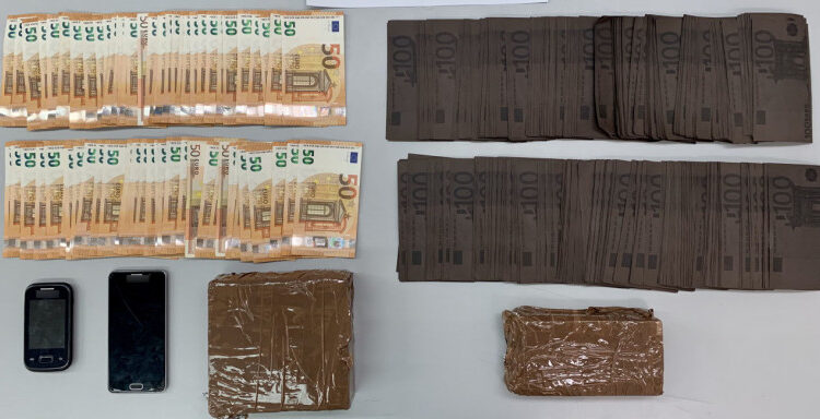 Από τις έρευνες που ακολούθησαν συνολικά βρέθηκαν και κατασχέθηκαν (3.450) ευρώ, πλήθος τεμάχια μαύρου χαρτιού με εντυπώσεις στοιχείων και διαστάσεις χαρτονομισμάτων των (100) ευρώ και (2) κινητά τηλέφωνα.