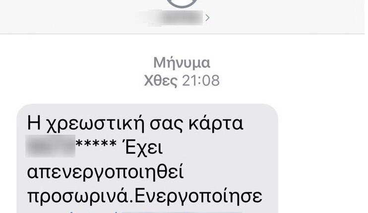 Έστειλαν sms στο κινητό τηλέφωνο ενημερώνοντας ότι δήθεν έχει απενεργοποιηθεί η χρεωστική τραπεζική κάρτα.