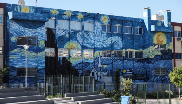 Πιο συγκεκριμένα στην πλευρά που «βλέπει» προς το ανοιχτό θέατρο «Μαίρη Αρώνη» το δίδυμο των Spylex Design δημιούργησαν τον γνωστό πίνακα του Van Gogh «Έναστρη Νύχτα».