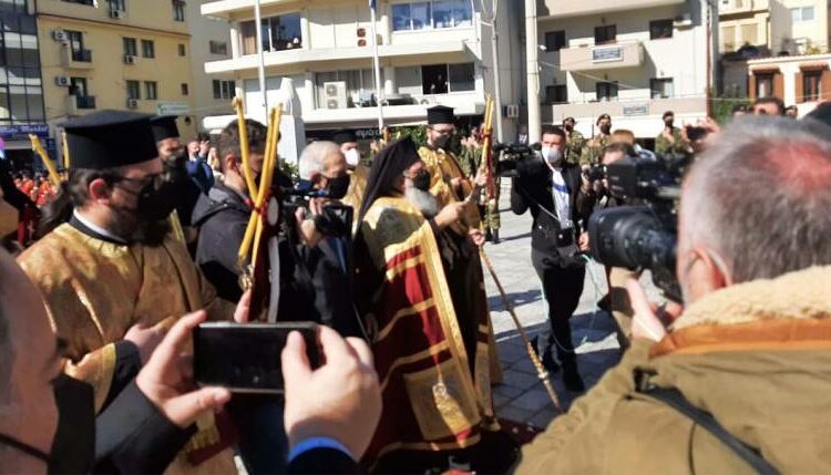 Ιερείς και ιερομόναχοι βρίσκονται στον προαύλιο χώρο του Μητροπολιτικού ναού, δίπλα τους η μπάντα του Δήμου και το τιμητικό άγημα του Στρατού ενώ πλήθος πιστών έχουν πάρει τις θέσεις τους. Στο εσωτερικό του ναού θα μπορέσουν να εισέλθουν περίπου 200 άτομα.