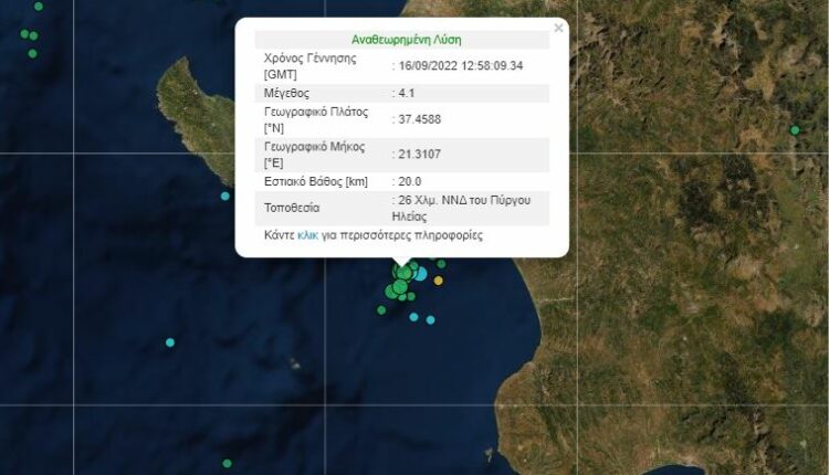 Σεισμός μεγέθους 4,1 βαθμών της κλίμακας Ρίχτερ σημειώθηκε πριν από λίγο στην θαλάσσια περιοχή του Πύργου.