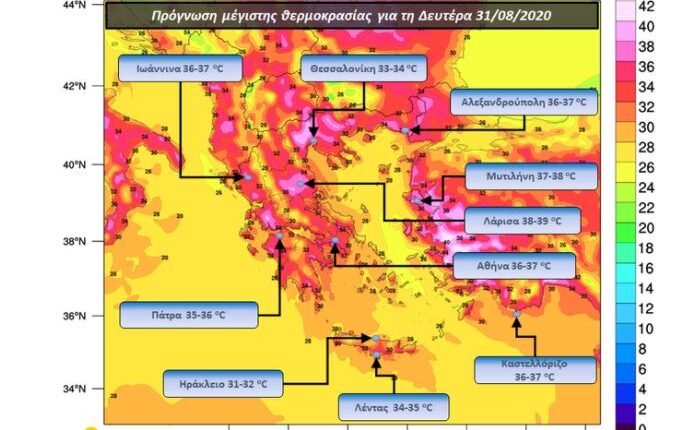 Σύμφωνα με τα προγνωστικά στοιχεία του Εθνικού Αστεροσκοπείου Αθηνών / Meteo.gr μάλιστα, ο Αύγουστος θα μας αποχαιρετήσει με πολύ υψηλές θερμοκρασίες, καθώς η εκτιμώμενη μέγιστη θερμοκρασία σήμερα θα φτάσει τοπικά στα κεντρικά ηπειρωτικά καθώς και στα νησιά του Ανατολικού Αιγαίου τους 38-39 βαθμούς Κελσίου, όπως διακρίνεται στον παρακάτω χάρτη.