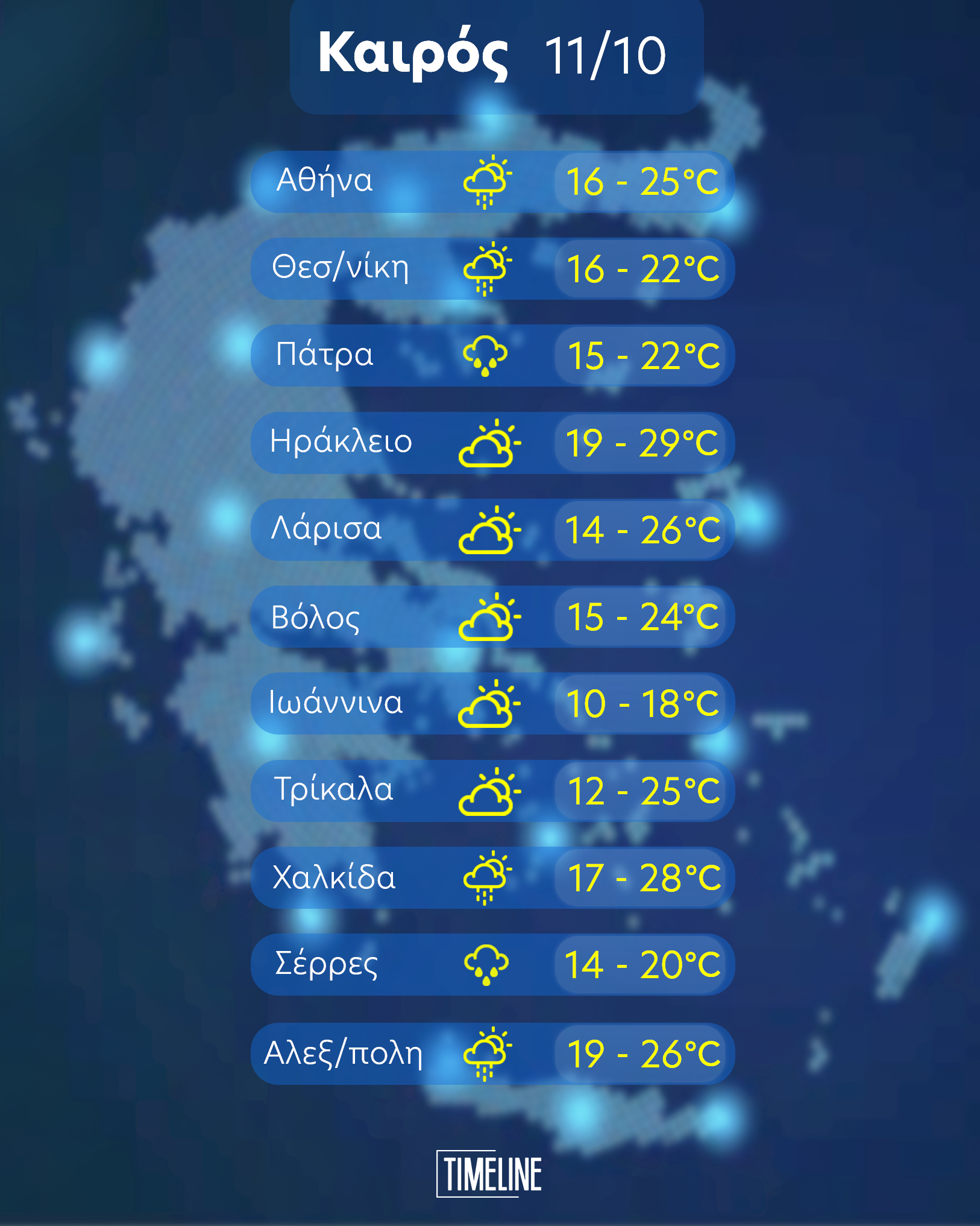 Σήμερα, Δευτέρα 11 Οκτωβρίου, βροχές θα εκδηλωθούν στις περισσότερες περιοχές της χώρας. Τα φαινόμενα θα είναι τοπικά ισχυρά και σε ορισμένες περιπτώσεις θα συνοδεύονται από αυξημένη κεραυνική δραστηριότητα, ενισχυμένους ανέμους και χαλαζοπτώσεις, σύμφωνα με τη μετεωρολογική υπηρεσία Meteo του Εθνικού Αστεροσκοπείου Αθηνών.