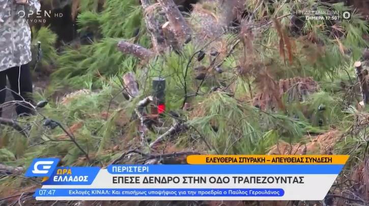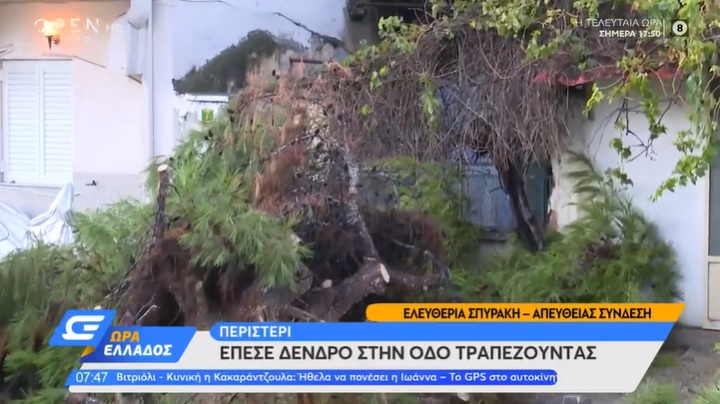 Η κακοκαιρία «Μπάλλος» προκάλεσε αρκετές πτώσεις δέντρων στην Αττική. Στο Περιστέρι ξεριζώθηκε ένα δέντρο 54 ετών. Οι κάτοικοι άκουσαν έναν δυνατό θόρυβο γύρω στις 3 το πρωί.