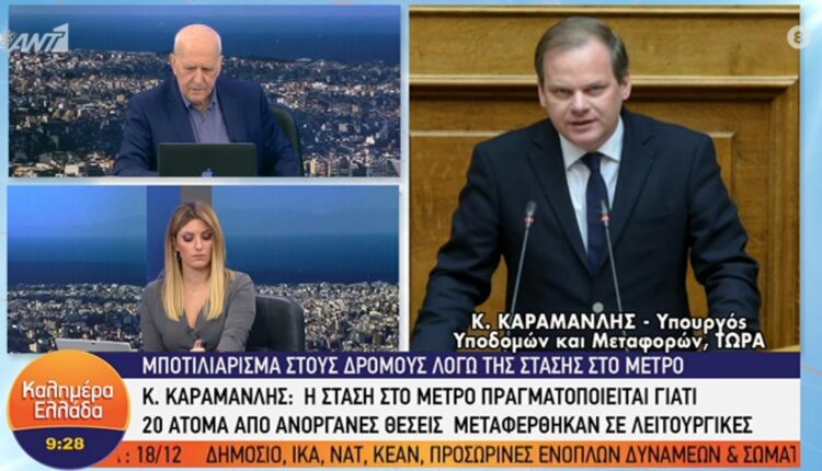 Με παρέμβασή του στην εκπομπή του Γιώργου Παπαδάκη, «Καλημέρα Ελλάδα», ο υπουργός Υποδομών και Μεταφορών, Κώστας Καραμανλής, προέβη σήμερα το πρωί σε δηλώσεις, αναφορικά με την αιφνίδια στάση εργασίας που κήρυξαν οι εργαζόμενοι του Μετρό.