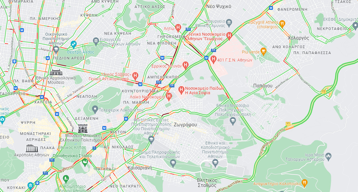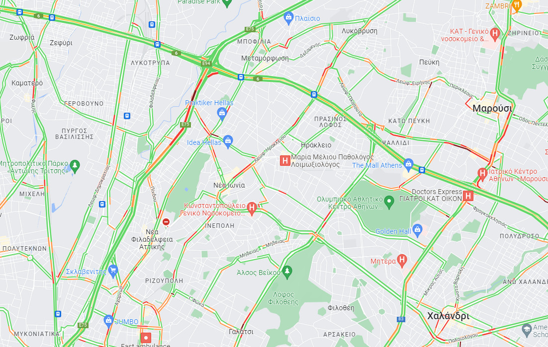 Χαμηλές ταχύτητες όμως σημειώνονται και στο κέντρο της Αθήνας, με την Κηφισίας στην άνοδο να παρουσιάζει προβλήματα μέχρι τα Σίδερα Χαλανδρίου και στην κάθοδο από το Μαρούσι μέχρι την αμερικανική πρεσβεία.