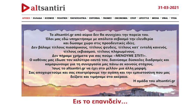 Τίτλοι τέλους για την ιστοσελίδα του Λάκη Λαζόπουλου, altsantiri.gr