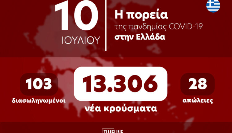 Ο ΕΟΔΥ σήμερα, Κυριακή 10 Ιουλίου, ανακοίνωσε13.306 νέα κρούσματα κορωνοϊού και 28 θανάτους. Οι διασωληνωμένοι ανέρχονται σε 103.