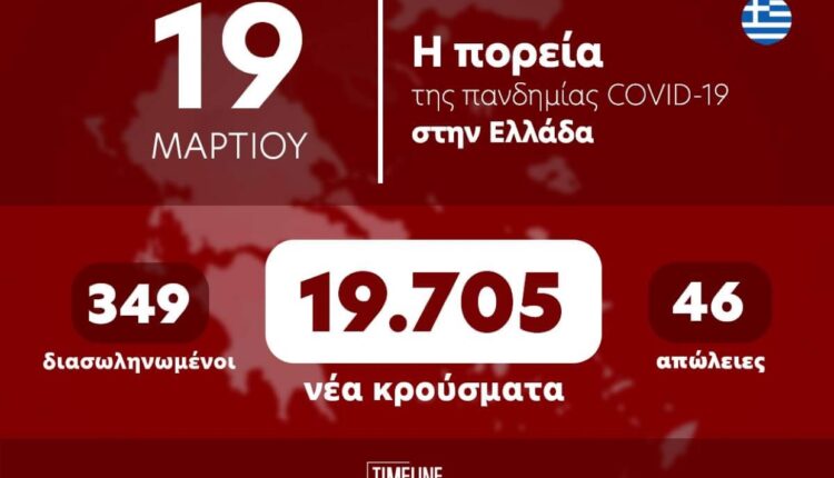 Τα νέα εργαστηριακά επιβεβαιωμένα κρούσματα της νόσου που καταγράφηκαν τις τελευταίες 24 ώρες είναι 19.705 , εκ των οποίων 19 εντοπίστηκαν κατόπιν ελέγχων στις πύλες εισόδου της χώρας. Ο συνολικός αριθμός των κρουσμάτων ανέρχεται σε 2.776.192 (ημερήσια μεταβολή +0.7%), εκ των οποίων 49.3% άνδρες.