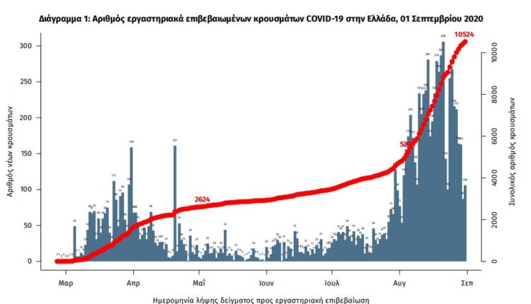 Σύμφωνα με την επίσημη ενημέρωση του ΕΟΔΥ, ο συνολικός αριθμός των κρουσμάτων κορωνοϊού ανέρχεται πλέον σε 10524, ενώ δύο επιπλέον ασθενείς Covid-19 νοσηλεύονται διασωληνωμένοι, με 38 συνολικά πολίτες να βρίσκονται σε ΜΕΘ.
