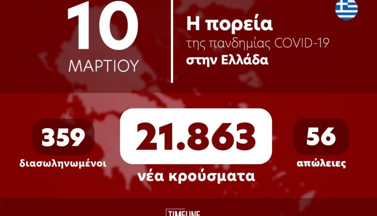 Τα νέα εργαστηριακά επιβεβαιωμένα κρούσματα της νόσου που καταγράφηκαν τις τελευταίες 24 ώρες είναι 21.863, εκ των οποίων 25 εντοπίστηκαν κατόπιν ελέγχων στις πύλες εισόδου της χώρας.