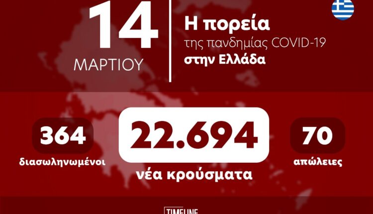 Ο ΕΟΔΥ ανακοίνωσε 22.694 κρούσματα σήμερα, Δευτέρα 14 Μαρτίου, καθώς και 70 θανάτους το τελευταίο 24ωρο σύμφωνα με την τελευταία ενημέρωση για τον κορωνοϊό στην Ελλάδα.