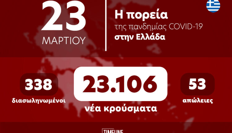 Ο ΕΟΔΥ ανακοίνωσε 23.106 κρούσματα σήμερα, Τετάρτη 23 Μαρτίου, καθώς και 53 θανάτους το τελευταίο 24ωρο σύμφωνα με την τελευταία ενημέρωση για τον κορωνοϊό στην Ελλάδα. Επίσης, στα νοσοκομεία νοσηλεύονται 338 διασωληνωμένοι ασθενείς με Covid.