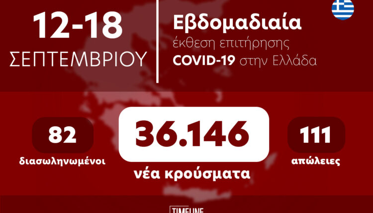 Τα στοιχεία που παρουσιάζονται αφορούν περιστατικά από την επιδημιολογική επιτήρηση της νόσου από τον νέο κορωνοϊό (COVID-19). Τα δεδομένα αφορούν την εβδομάδα αναφοράς ISO 37/2022 (12 Σεπτεμβρίου 2022 – 18 Σεπτεμβρίου 2022).