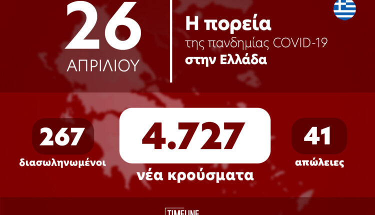 Τα στοιχεία που παρουσιάζονται αφορούν περιστατικά από την επιδημιολογική επιτήρηση της νόσου από το νέο κορωνοϊό (COVID-19), με βάση τα δεδομένα που έχουν δηλωθεί στον ΕΟΔΥ και καταγραφεί μέχρι τις 26 Απριλίου 2022 (ώρα 09:00). Τα νέα εργαστηριακά επιβεβαιωμένα κρούσματα της νόσου(άτομα) που καταγράφηκαν τις τελευταίες 24 ώρες ήταν 4.727. Ο συνολικός αριθμός των ατόμων που νόσησαν ανέρχεται σε 3.290.895 (ημερήσια μεταβολή +0.1%), εκ των οποίων 48.9% άνδρες. Ο αριθμός πιθανών νέων επαναλοιμώξεων που καταγράφηκαν τις τελευταίες 24 ώρες ήταν 121 ενώ από την αρχή της πανδημίας SARS-CoV-2 ο συνολικός αριθμός εκτιμάται σε 121.432(3.6% του συνολικού αριθμού των θετικών αποτελεσμάτων).