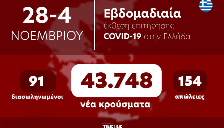 Πάνω από 43.000 είναι τα κρούσματα που ανακοίνωσε ο ΕΟΔΥ για την εβδομάδα 28 Νοεμβρίου έως και 4 Δεκεμβρίου, με τον αριθμό να είναι ελαφρώς μειωμένος, μόλις 1% από αυτά που καταγράφηκαν το προηγούμενο επταήμερο (21 με 27 Νοεμβρίου).
