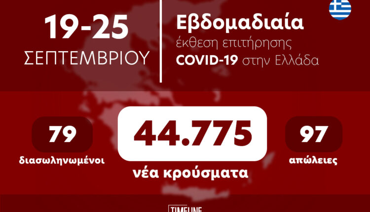 Από την 1η Ιανουαρίου 2020 μέχρι 25 Σεπτεμβρίου 2022 , στα εργαστήρια που διενεργούν ελέγχους για τον SARS-CoV-2 και που δηλώνουν συστηματικά το σύνολο των δειγμάτων που ελέγχουν, έχουν συνολικά ελεγχθεί 12.585.378 (7μερος μ.ό.: 9.576, 3% εβδομαδιαία μεταβολή) κλινικά δείγματα ενώ από Μονάδες Υγείας και Κλιμάκια του ΕΟΔΥ που διενεργούν ελέγχους Rapid Ag έχουν ελεγχθεί 81.554.588 δείγματα (7μερος μ.ό.: 84.920, 8% εβδομαδιαία μεταβολή).