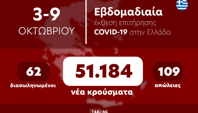 Τα στοιχεία που παρουσιάζονται αφορούν περιστατικά από την επιδημιολογική επιτήρηση της νόσου από το νέο κορωνοϊό (COVID-19). Τα δεδομένα αφορούν την εβδομάδα αναφοράς από τις 03 Οκτωβρίου 2022 έως τις 09 Οκτωβρίου 2022). Ειδικότερα ο ΕΟΔΥ ανακοίνωσε ότι την εβδομάδα αναφοράς καταγράφηκαν 51.184 κρούσματα COVID-19 (4.906 ανά εκατoμμύριο πληθυσμού: -7% εβδομαδιαία μεταβολή) εκ των οποίων οι επαναλοιμώξεις αφορούν το 23% των λοιμώξεων. Ο συνολικός αριθμός των λοιμώξεων από την έναρξη της πανδημίας ανέρχεται σε 5.026.494 εκ των οποίων 52.0% γυναίκες.