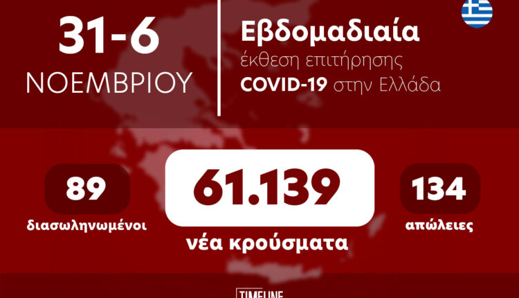 Τα στοιχεία που παρουσιάζονται αφορούν περιστατικά από την επιδημιολογική επιτήρηση της νόσου από το νέο κορωνοϊό (COVID-19). Τα δεδομένα αφορούν την εβδομάδα αναφοράς από τις 31 Οκτωβρίου 2022 έως τις 06 Νοεμβρίου 2022.
