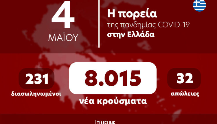 Κορωνοϊός: 8.015 κρούσματα σήμερα – 32 νεκροί και 231 διασωληνωμένοι