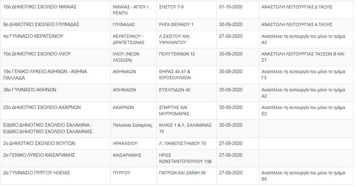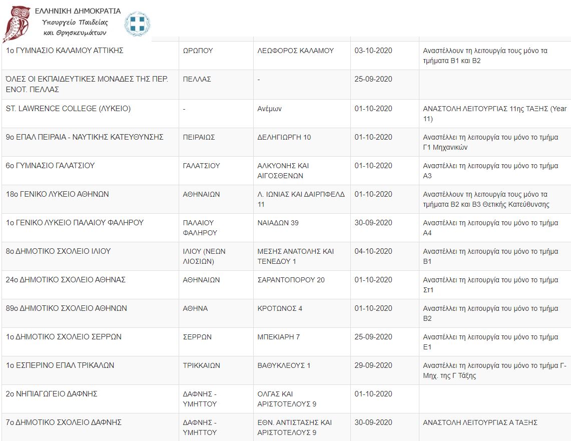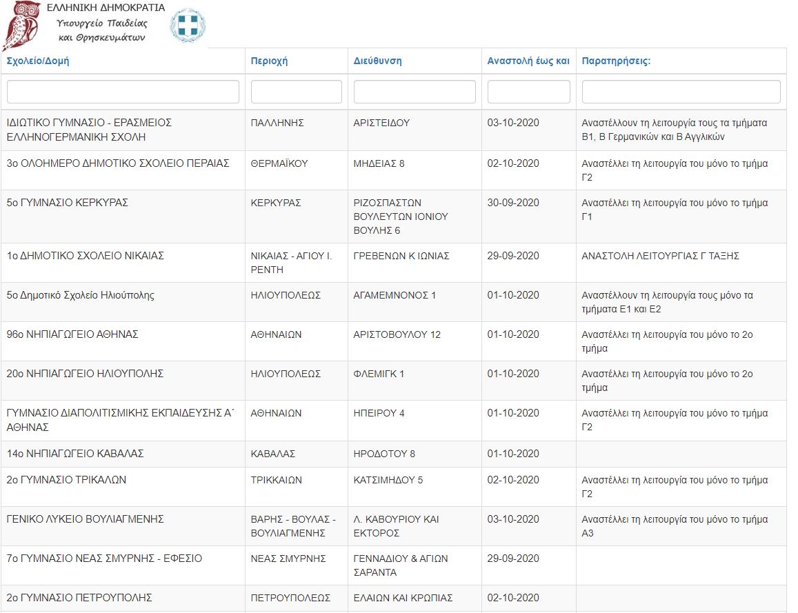 Η λίστα με τα σχολεία, η λειτουργία των οποίων αναστέλλεται -τμηματικά ή εν συνόλω- εξ αιτίας της πανδημίας του κορωνοϊού βρίσκεται στην ιστοσελίδα του υπουργείου (https://www.sch.gr/anastoli/web/index.php) και ανανεώνεται ανά τακτά διαστήματα.