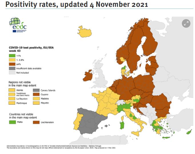 Όσον αφορά στον δείκτη θετικότητας, οι παραπάνω περιοχές βρίσκονται στο «κίτρινο» (1-3,9%) αλλά και η Πελοπόννησος, με εξαίρεση την Ηλεία και την Αχαΐα.